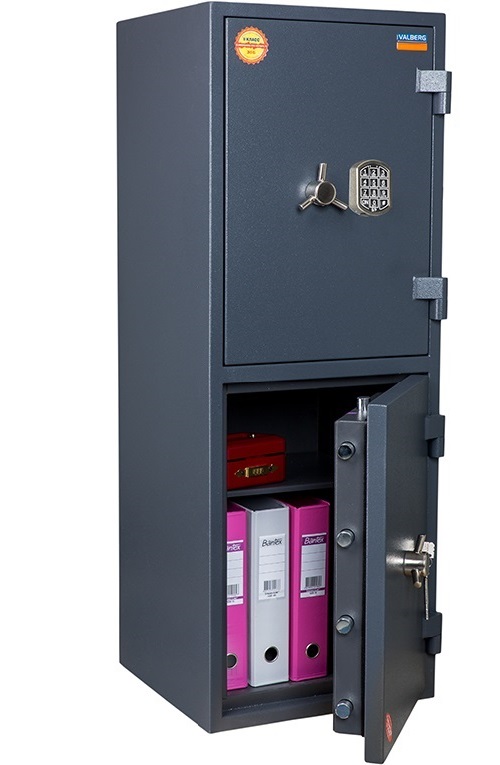 - Верхняя секция изделия запирается электронным кодовым замком PS 600 высокого уровня секретности. Нижняя секция – ключевым замком KABA MAUER (class B), производства Германии.