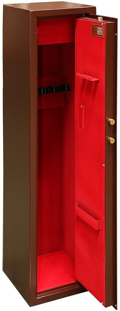— Внутренняя отделка – флокированный бархат, успешно оберегающий оружие от царапин. Снаружи сейф покрыт специальным защитным лаком; цветовое решение – эффектный оттенок сочной вишни.