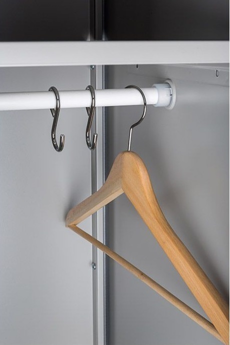 - Данная модель оборудована четырьмя полками, перекладиной для вешалок, крючками для одежды.