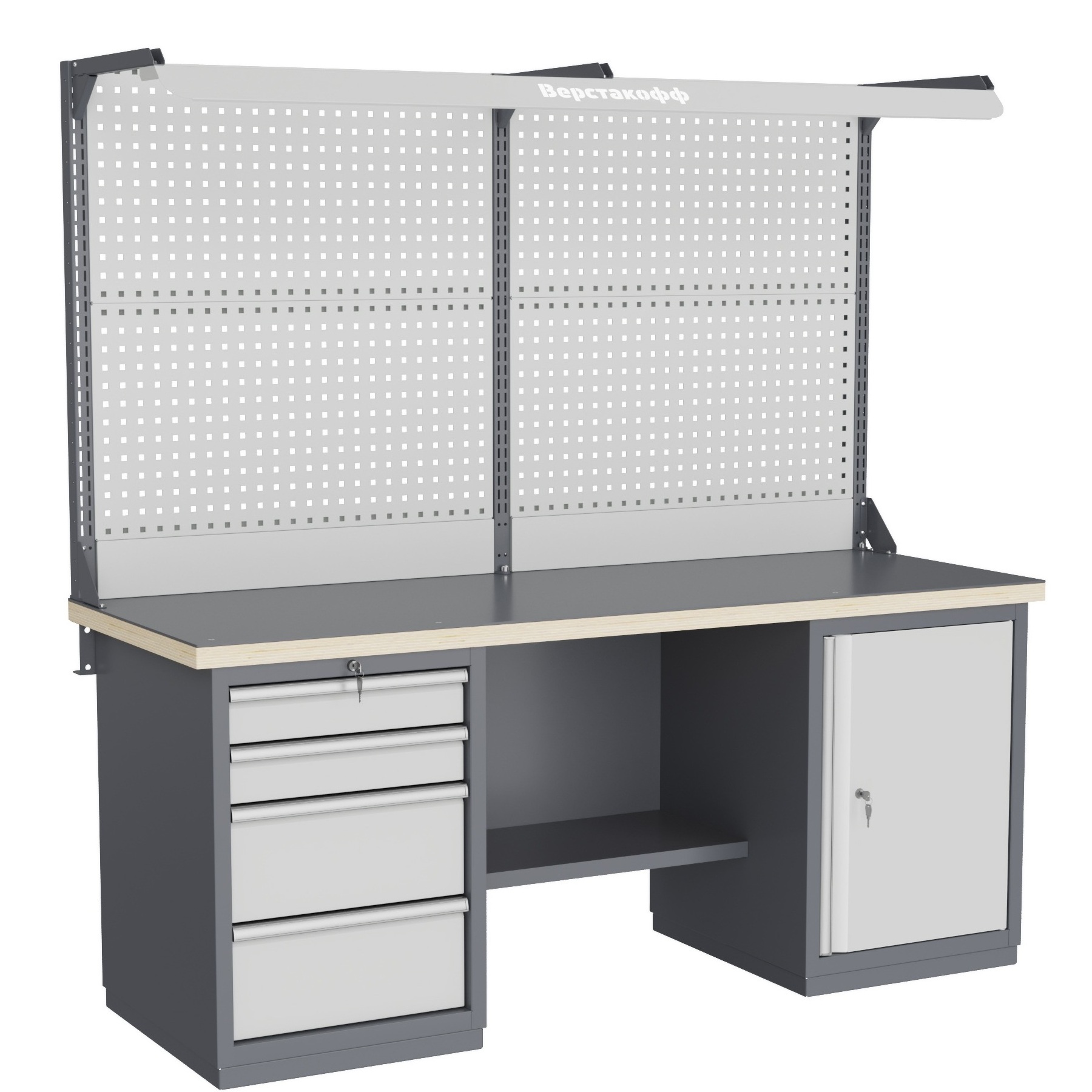 - Рабочее место комплектуется двойным перфорированным экраном, на котором удобно размещать держатели для инструментов, полки и другие навесные элементы, благодаря чему весь необходимый инвентарь всегда будет на виду.